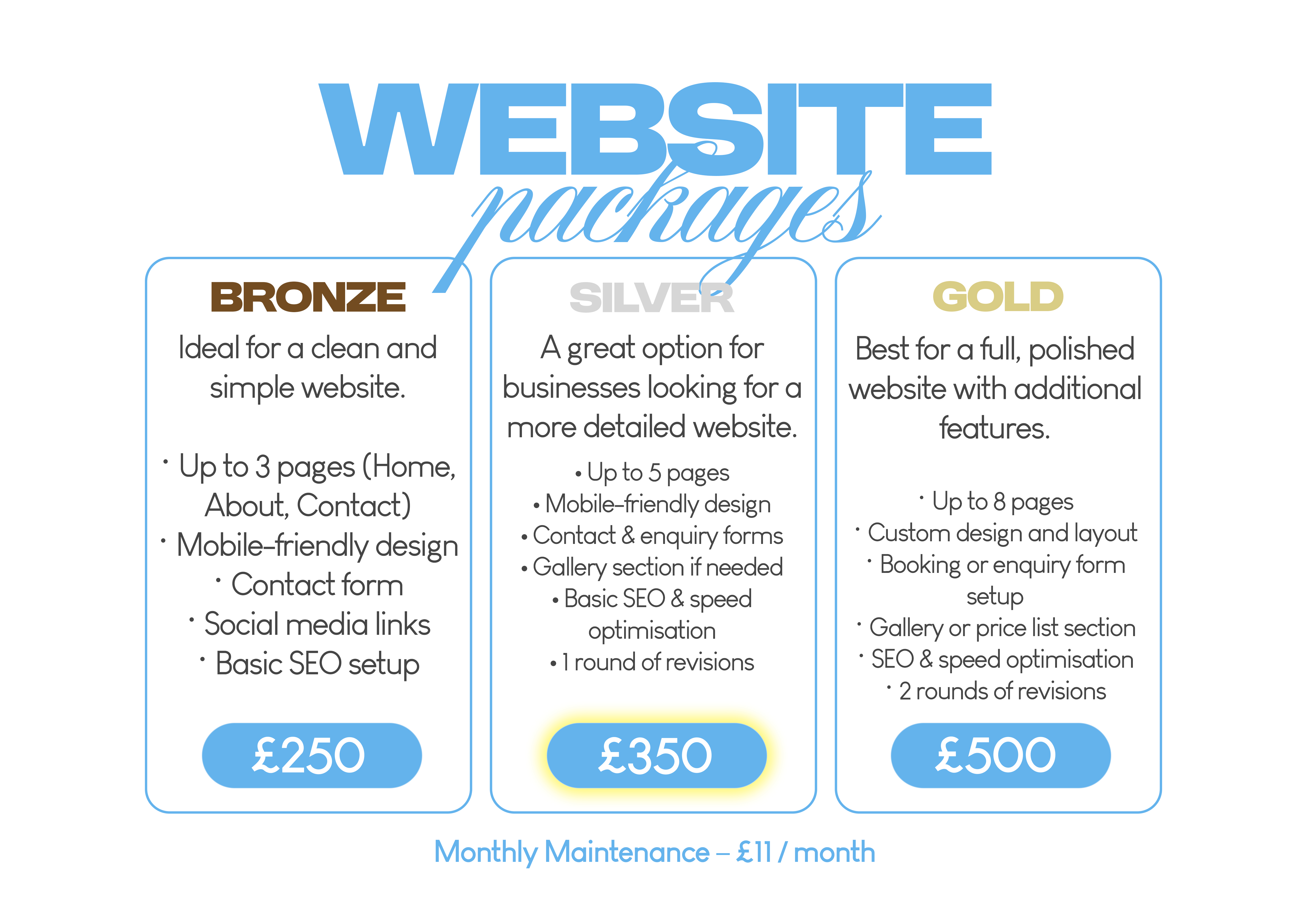 Here is everything we offer, keep scrolling to find out more about specific packages etc.